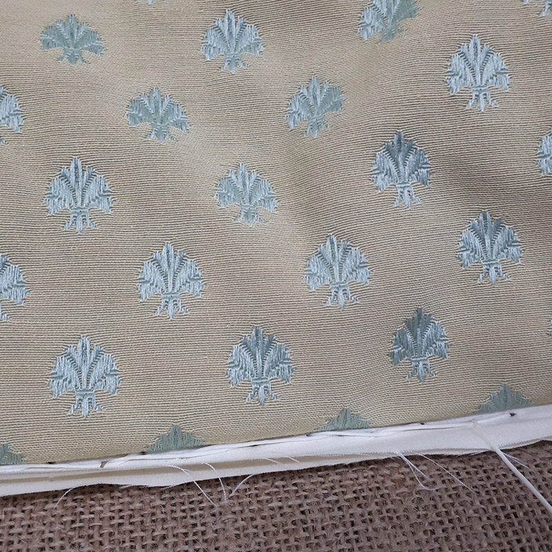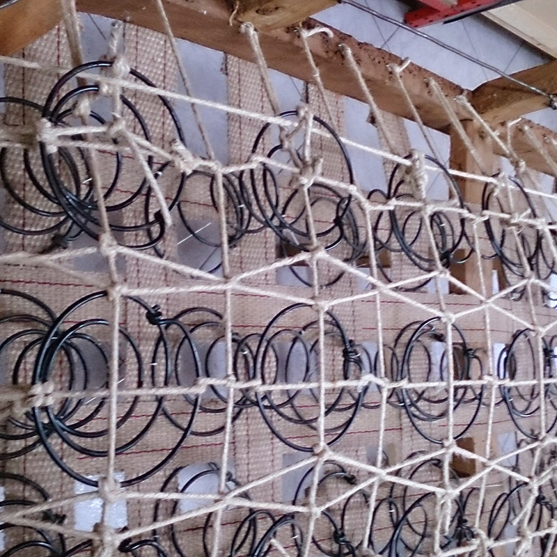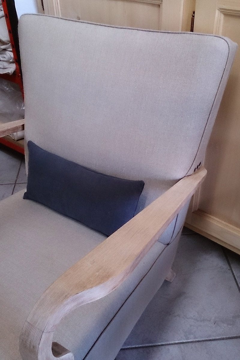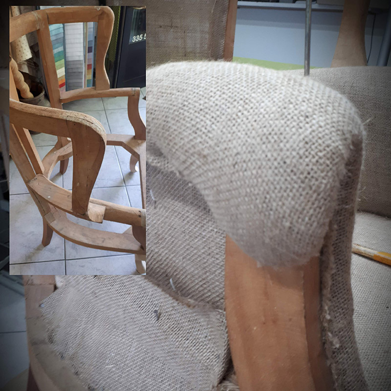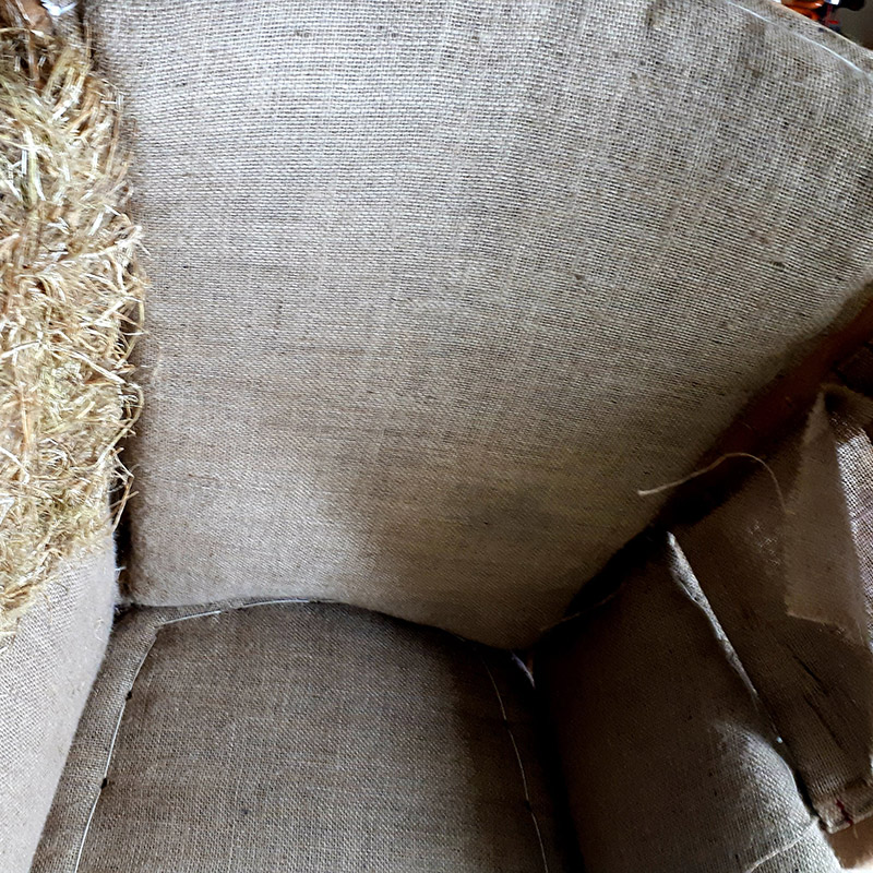 particolare lavorazione eseguita su poltrona “Bergere” con utilizzo di cascame di lino, crine vegetale, tela yuta