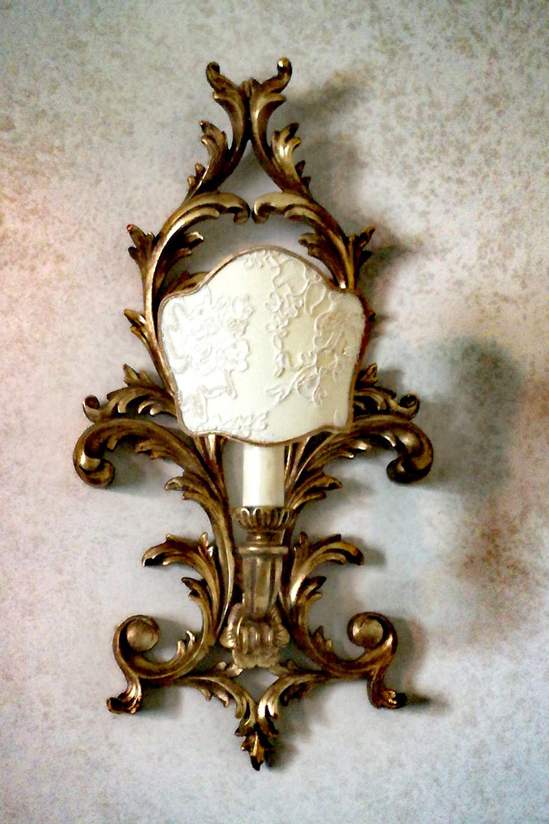 “applique murale” in legno intagliata con ventolina rivestita in prezioso ricamo