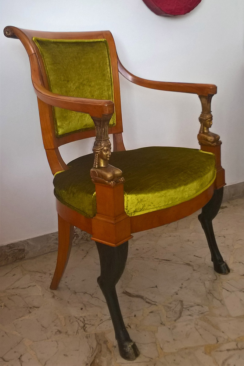rivisitazione in chiave moderna di poltrona in stile, con cariatidi e gambe anteriori a zampa di cervo