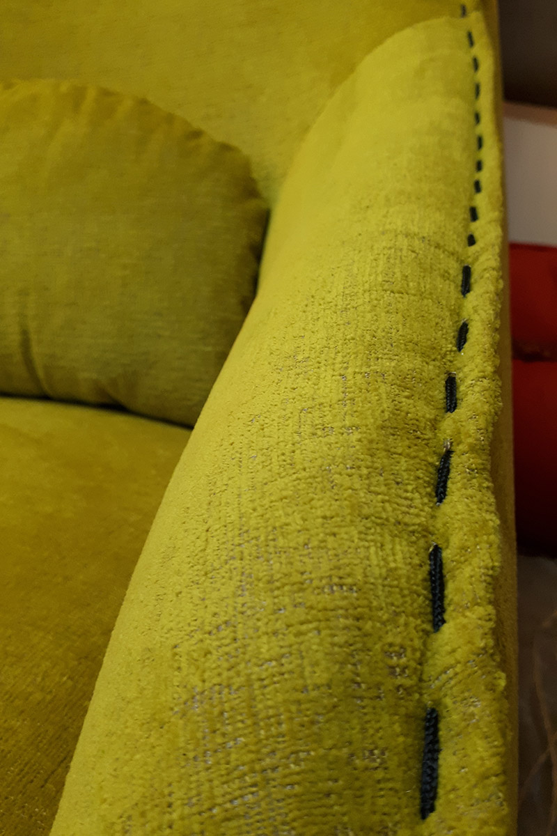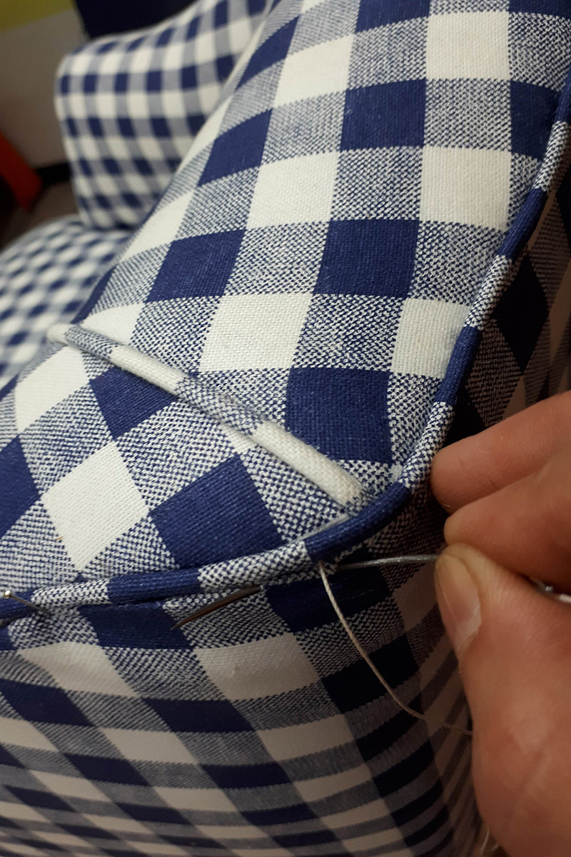particolare di cucitura eseguita a mano con ago curvo su poltrona stile ‘800