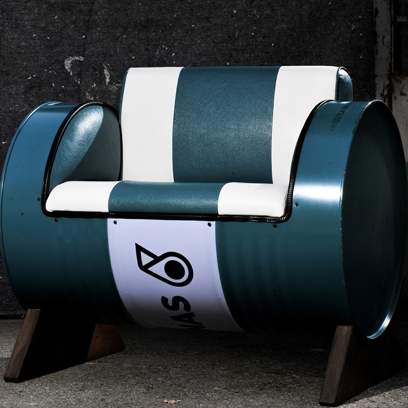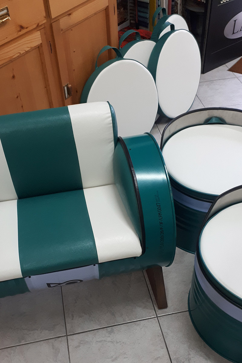 studio, realizzazione di imbottiture e rivestimento su barili per olio trasformati in sedute