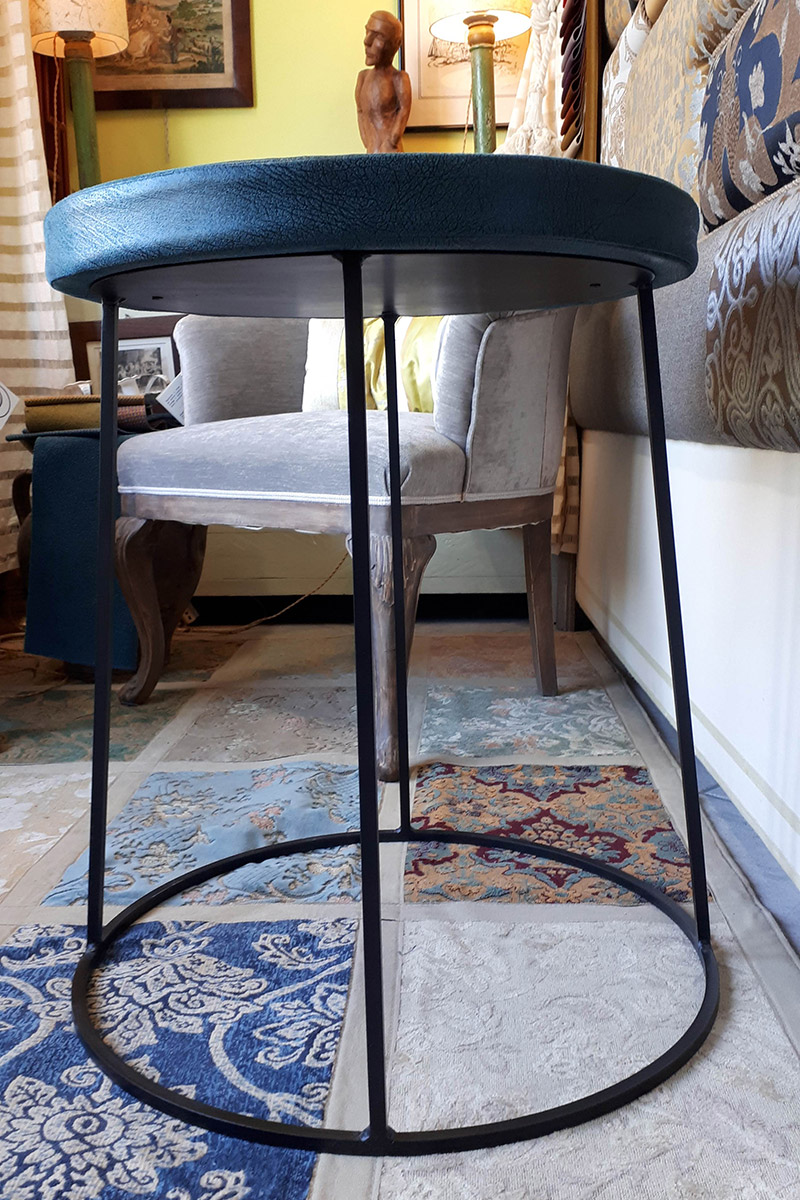 tavolino a tronco di cono in ferro fatto a mano a sezione quadrata con ripiano in legno rivestito in tessuto