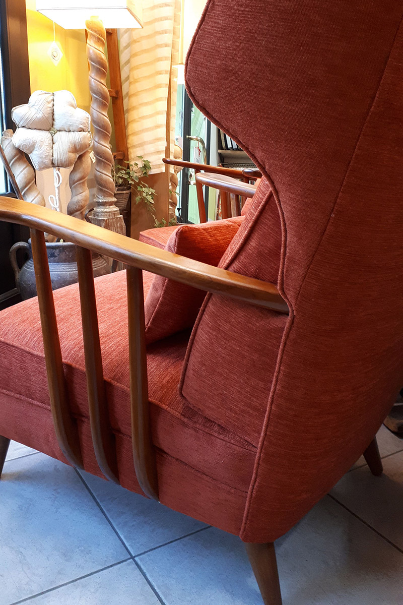 particolare della finitura del bracciolo in legno poltrona vintage anni 1950