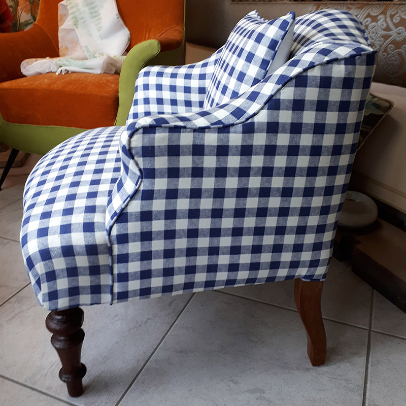 poltrona a quadri bianchi e blu, stile “800 dopo lavoro di restauro, finiture con cuciture a mano